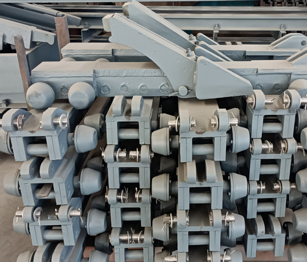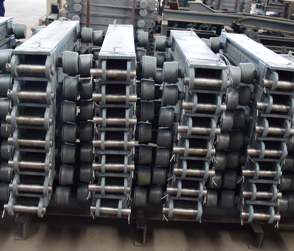 TBC型液壓銷齒推車機由推爪、拉爪、鏈接、滑道、支撐梁、驅(qū)動裝置等組成,主要用于礦井車場的裝卸罐籠、調(diào)運礦車。是裝罐推車機、列車推車機組合的升級產(chǎn)品。其優(yōu)點是:1、能進罐推車,實現(xiàn)了裝罐、卸罐、調(diào)車一體化,實現(xiàn)了一機多用,免去礦車裝罐時的人工推車,降低了工人的勞動強度,保證了安全生產(chǎn),提高了生產(chǎn)效率。2、采用液壓馬達驅(qū)動、銷齒傳動,適用于各種環(huán)境,沖擊小、抗過載能力強。3、采用長鏈節(jié),減少了車輪,使易損件更少,維雅維機護量更小。4、驅(qū)動裝置與滑道一體,取消了地腳螺栓,安裝更方便,同時也避免了現(xiàn)場安裝帶來的安裝誤差,保證了精度,提高設(shè)備性能。5、滑道采用12#礦用工字鋼,提高了滑道強度,避免了滑道變形,提高了設(shè)備的可靠性和適應性。6、搖臺滑道和罐內(nèi)滑道采用角鋼,徹底避免了推車機進罐卡、別的現(xiàn)象。7、采用低速大扭矩馬達,推力強勁,便于大型設(shè)備的整體裝卸罐籠和調(diào)運。8、推爪為長起式,拉爪起落可控,運行安全可靠,自動化程度高。